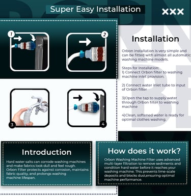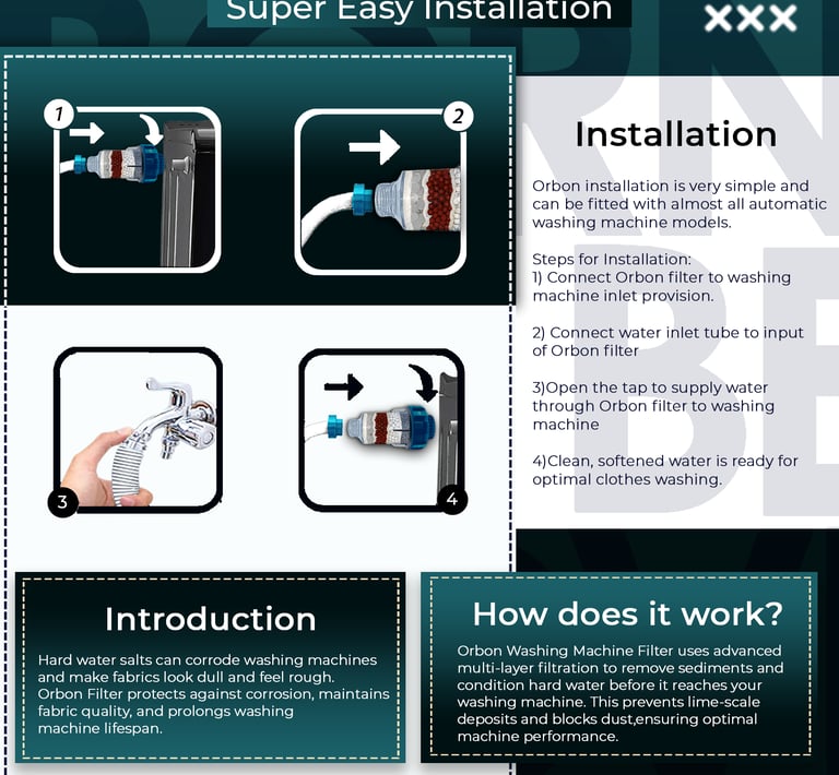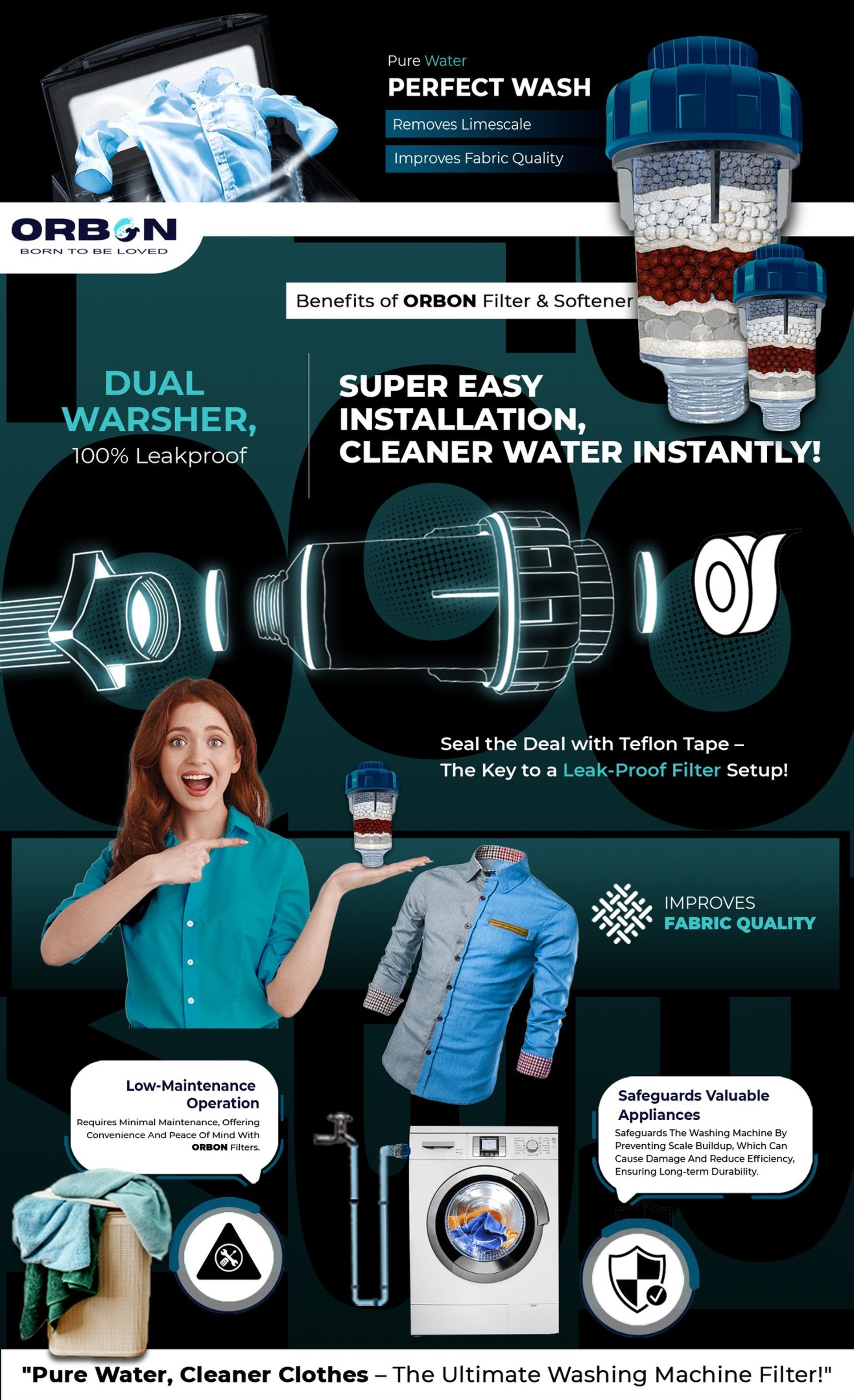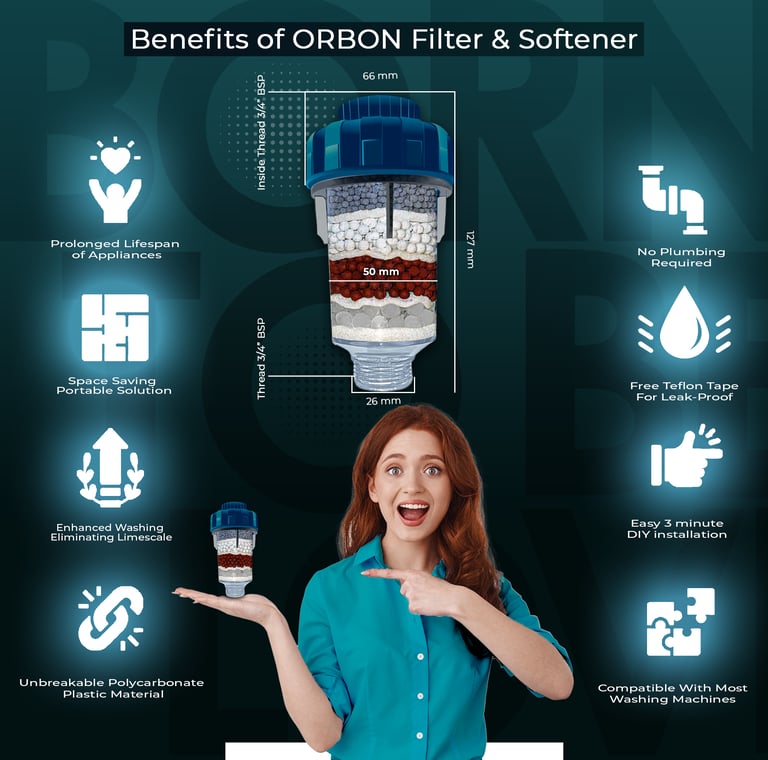 Hard water causes limescale buildup, poor washing performance, and early machine failure. The ORBON Filter & Softener helps soften incoming water, reduces residue, and enhances wash quality—without plumbing changes. A compact, DIY solution designed for long-lasting performance and everyday convenience.